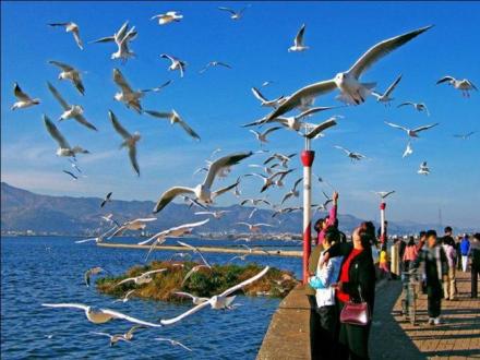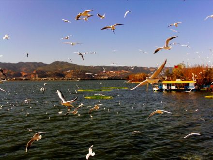 滇池位于昆明市南的西山腳下,其北端緊鄰昆明市大觀公園,南端至?xí)x寧縣內(nèi),距市區(qū)5km,歷史上這里一直是度假觀光和避暑的勝地。滇池形似弦月,南北長(zhǎng)39km,東西寬13.5km,平均寬度約8km。湖岸線長(zhǎng)約200km;湖面面積300k㎡,居云南省首位,湖水最大深度8m,平均深度5m,蓄水量15.7億,素稱“五百里滇池”。是中國(guó)第六大內(nèi)陸淡水湖。