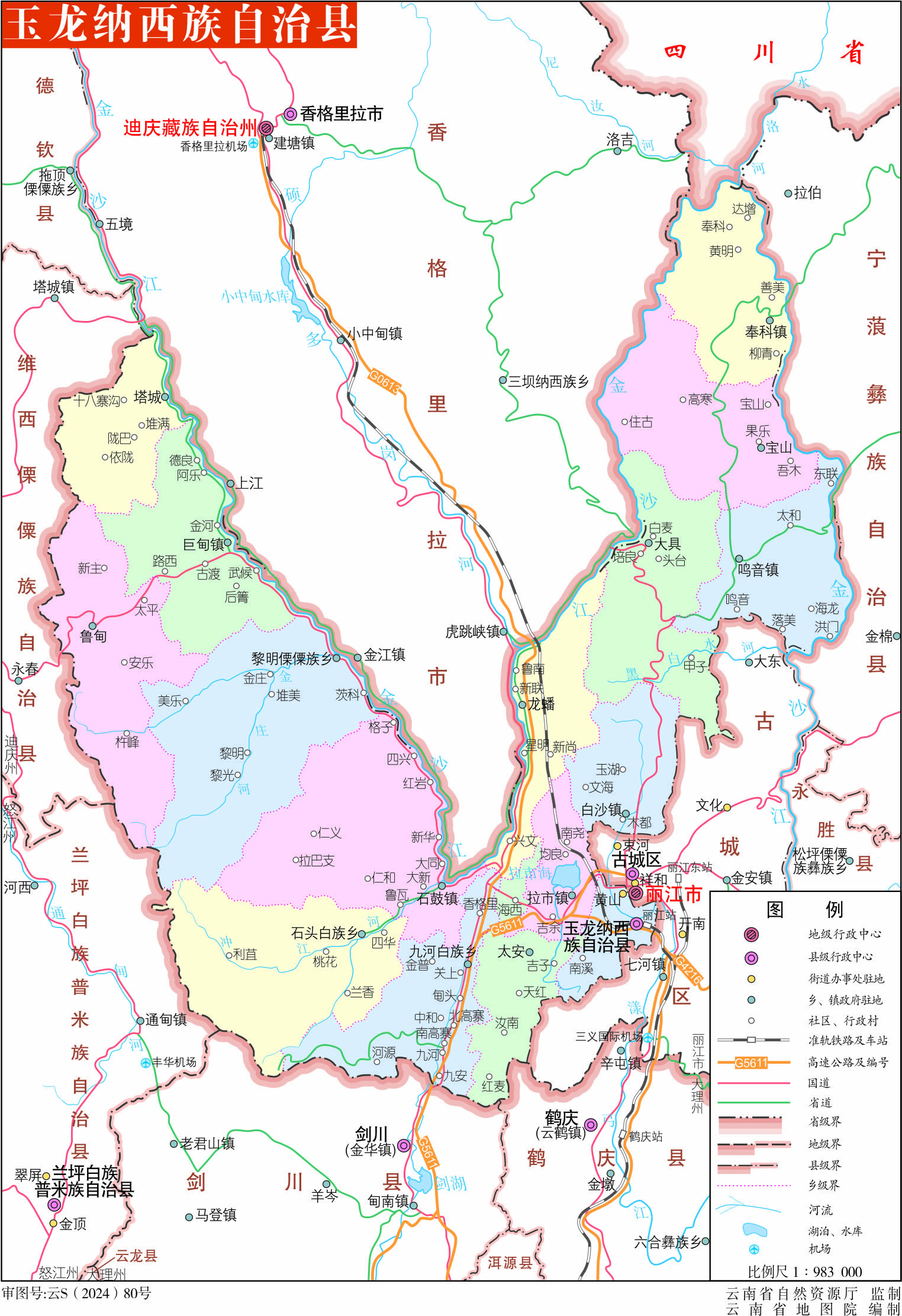 鎮(zhèn):石鼓鎮(zhèn)、巨甸鎮(zhèn)、白沙鎮(zhèn)、拉市鎮(zhèn)、奉科鎮(zhèn)、鳴音鎮(zhèn)