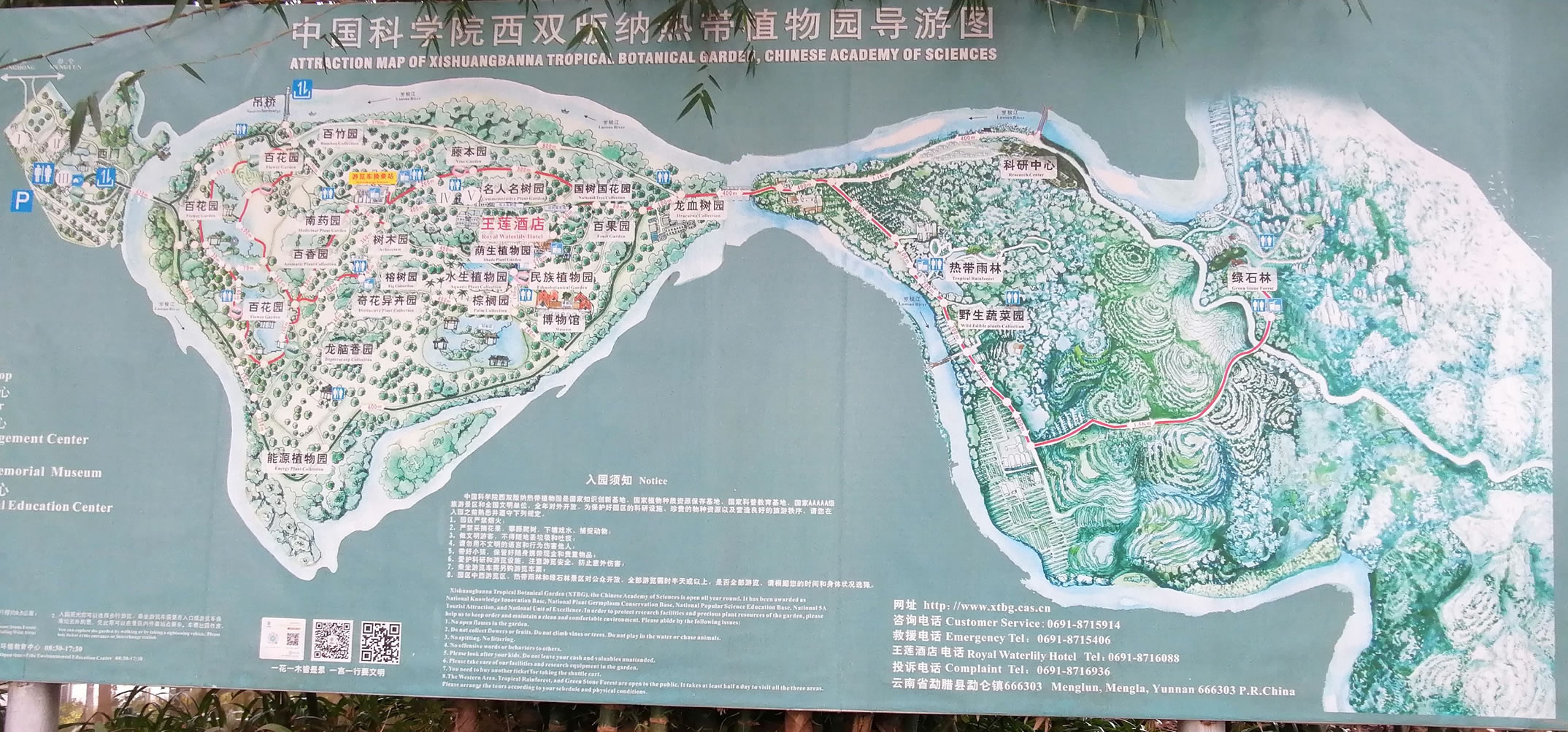 截至2015年9月,在占地面積約為11.25km2中國科學(xué)院西雙版納熱帶植物園里,收集有活植物12000多種,建有38個(gè)植物專類區(qū),還保存有一片面積約250hm2的原始熱帶雨林。