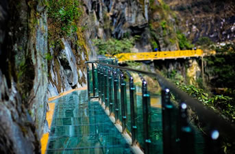 石門關(guān)景區(qū)高空玻璃棧道蜿蜒盤旋于石門關(guān)隘口北面清涼山的懸崖峭壁上,拾級而上,最高點是一段長80米的玻璃棧道,行走其中猶如“凌空漫步”,驚險刺激。此外,棧道另一側(cè)還有一個凸出棧道外7米的玻璃觀景平臺,可供游客俯瞰全景。