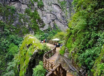 、诟呖諚5捞诫U游路:福緣橋——龍王廟——天開石門——鶴峰亭——五道水服務(wù)區(qū)——高空玻璃棧道——七彩玻璃觀景平臺——高空棧道——七道水彩虹橋——七道水瀑布——野生芭蕉林——百步天梯——萬獸谷——枯木要塞。全長3500米,