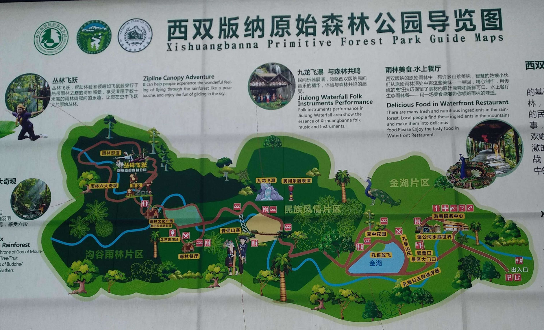 公園占地面積26310畝,園內森林覆蓋率為98.6%,是目前北回歸線以南保存最完好的一片原始森林,它的自然優(yōu)勢融匯了原始森林神奇的自然風光和濃郁的民俗風情,集中突出體現(xiàn)了"熱帶溝谷雨林"、"以孔雀文化為主的野生動物展示"、"以哈尼族-愛尼人為主的民俗風情展示"三大主題特色,同時配備有按四星級打造集客房、餐飲、會務、娛樂為一體的孔雀山莊度假村。"勐巴拉納西"是一個充滿美好、理想和神奇的地方,旖旎的自然風光、翡翠般的森林、絢麗多姿的民族風情,膠園、茶園、瀾滄江。