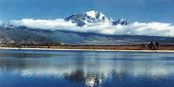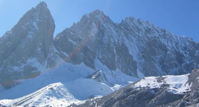 十三峰,峰峰終年積雪不化,似一排玉柱立地擎天,主峰扇子陡,海拔5596米,是世界上北半球緯度最低、海拔最高的山峰。