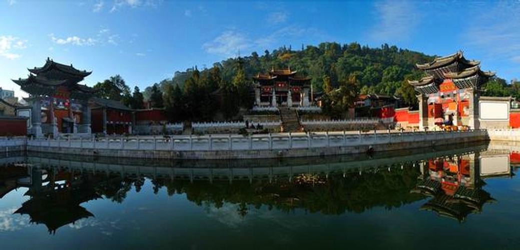 始建于元末,歷經(jīng)明清歷代重建重修,現(xiàn)為清初和清末的建筑。寺中保存下一堂(六扇)木雕槅門,出自清末滇南木雕藝術(shù)家高應(yīng)美之手,槅子門中的構(gòu)圖、布局、人物造型,被省內(nèi)外學(xué)者稱之為“海內(nèi)第一木雕”。三圣宮布局為三進(jìn)式兩院,由大殿、后東西兩廂、中殿、前東西兩廂、前殿(重檐)及前、中、后的六個(gè)躲間組成,外設(shè)圍墻并呈船形,墻外雙溪環(huán)繞而過。1993年被省政府公布為“第四批文物保護(hù)單位”。