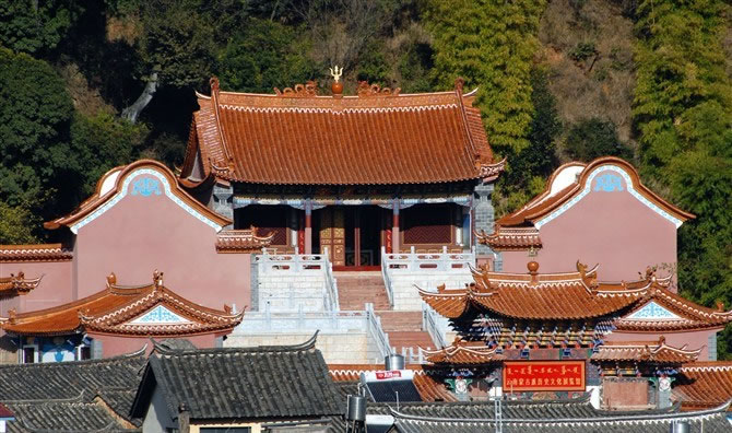 位于秀山后面,始建于明萬歷二十四年(1596年),因?yàn)樗屡杂幸蝗湃司徒ù怂虏⑺荦埻跸窆┯谒轮。白龍寺屬一進(jìn)院前后各三間夾四耳、寺內(nèi)保存一塊明代碑刻,碑陰記錄了當(dāng)時(shí)海貝巴(貝幣)的捐贈情況。上世紀(jì)80年代在白龍寺下開辟了茶花園、牡丹園、蘭花園,總占地8000多平方米。秀山古建筑群于1987年被省政府公布為“第三批文物保護(hù)單位”。
