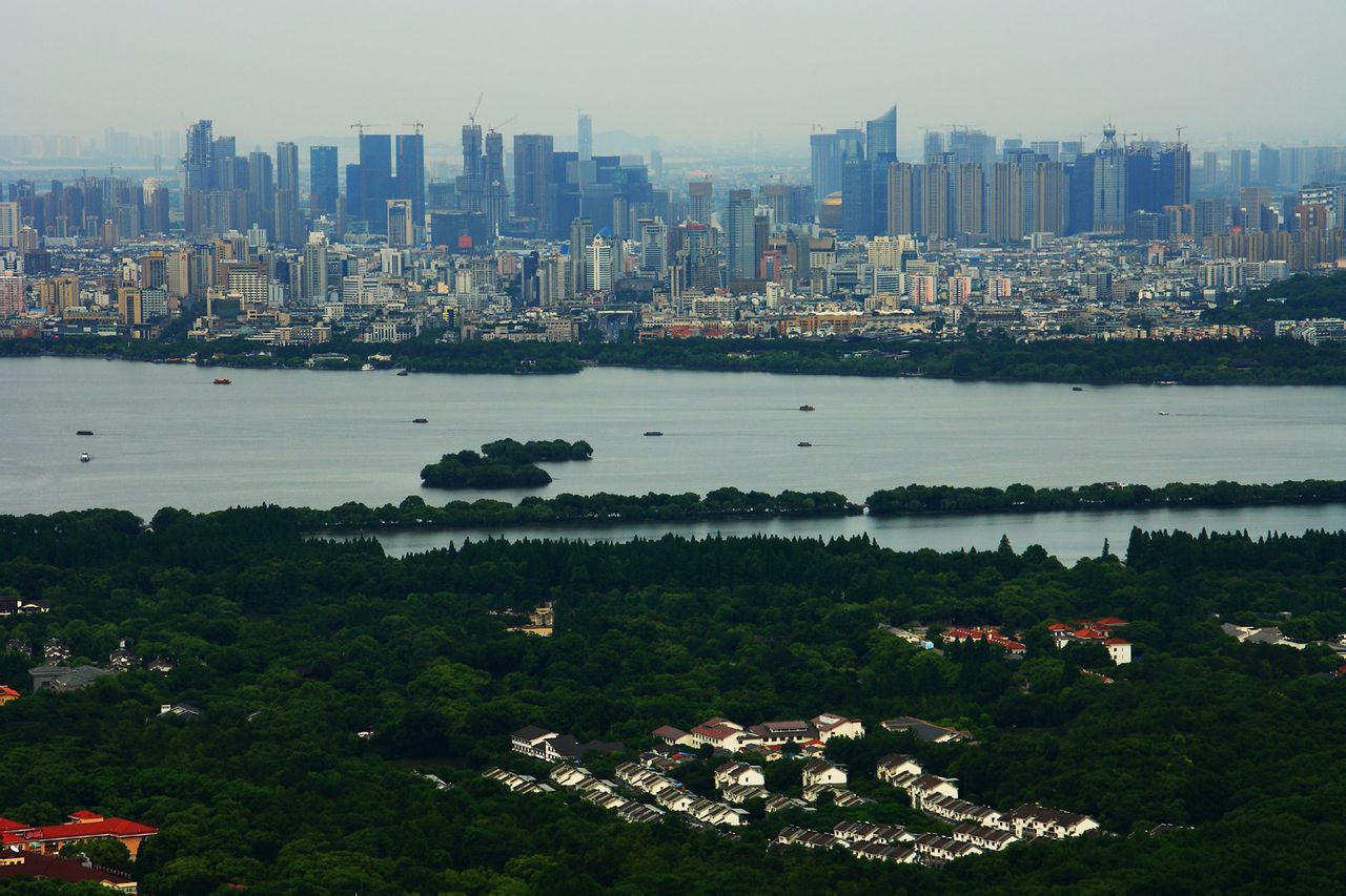 杭州市有著江、河、湖、山交融的自然環(huán)境。全市丘陵山地占總面積的65.6%,平原占26.4%,江、河、湖、水庫(kù)占8%,世界上最長(zhǎng)的人工運(yùn)河—京杭大運(yùn)河和以大涌潮聞名的錢塘江穿過。
