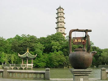 西塔始建于北宋開(kāi)寶二年(969年),一說(shuō)建于唐咸通十年(869年),明、清曾多次修繕。塔高32米,底徑7米,6邊形,7層,中空,系樓閣式青磚仿木構(gòu)建筑。遠(yuǎn)遠(yuǎn)望去,碧水藍(lán)天,全身披綠的西峰山托著磚紅色寶塔,塔剎直入云端,蔚為壯觀。就近處,江風(fēng)吹動(dòng)四十二個(gè)檐角的銅風(fēng)鈴送聲,四周枝頭飛禽清脆的啼嗚,交響成趣。塔每層每面均有小佛龕,內(nèi)置石雕佛像,造型精致,神態(tài)自然,有頗高的藝術(shù)價(jià)值,塔周?chē)们嗍,萬(wàn)木扶疏。因塔身傾斜,曾于1982年進(jìn)行大修葺。今塔仍保持宋代風(fēng)格。
