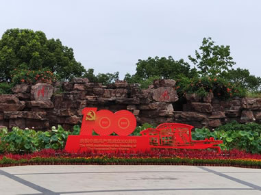 是為紀(jì)念中國共產(chǎn)黨第一次全國代表大會在南湖閉幕而建造的一座革命紀(jì)念館。作為中共“一大”會址重要場館和黨的誕生地,1959年根據(jù)有關(guān)部門的決定,經(jīng)中央審查同意,嘉興市籌建南湖革命紀(jì)念館,不僅仿制了南湖畫舫,還在湖心島建立了南湖革命紀(jì)念館,紅船?康暮男u成為最初的館舍,于煙雨樓大廳中開辟中共“一大”史料陳列。1991年7月,為慶祝中國共產(chǎn)黨成立70周年,紀(jì)念館移建南湖北岸,由鄧小平同志題寫?zhàn)^名,建設(shè)資金主要由黨員自愿捐獻(xiàn)。建成的紀(jì)念館由鐮刀、錘子形組成的紀(jì)念性建筑物,占地面積3800平方米,建筑面積1980平方米。紀(jì)念館坐北朝南,廣場上有高大威嚴(yán)的宣誓臺和大型石雕照壁以及四個火炬型花壇。在鮮花擁簇下,紀(jì)念館顯得莊嚴(yán)雄偉。沿著臺階進(jìn)入陳列大廳,正面是一艘南湖紅船模型和“中國共產(chǎn)黨第一次全國代表大會史料陳列”,兩個展廳分別布置了《中國共產(chǎn)黨第一次代表大會史料陳列》、《黨和國家領(lǐng)導(dǎo)人對南湖的關(guān)懷》等陳列,其中包括江澤民、胡錦濤、朱镕基、楊尚昆、宋平、姚依林、彭真等中央領(lǐng)導(dǎo)同志前來參觀、考察的照片和江澤民、李鵬、陳云、李先念等同志為紀(jì)念館的題詞。南湖革命紀(jì)念館是中國百個愛國主義教育基地之一,每年有近百萬的游人前來參觀瞻仰。