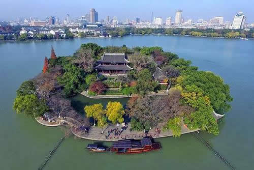 湖心島位于南湖中心,全島面積17畝。明嘉靖二十七年(公元1548年)嘉興知府趙瀛組織疏浚城河,將淤泥壘土成島,次年移建煙雨樓于島上。清以后又相繼建建成清暉堂、孤云簃、小蓬萊、來許亭、鑒亭、寶梅亭、東和西御碑亭、訪蹤亭等建筑,形成了以煙雨樓為主體的古園林建筑群,亭臺樓閣、假山回廊、古樹碑刻,錯落有致,是典型的江南園林。