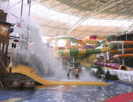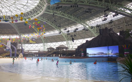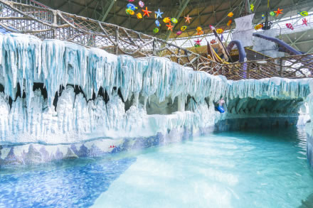 水之王國場館擁有室內沙灘、超大型組合滑道(異域湍流)、冰谷漂流等項目設施。