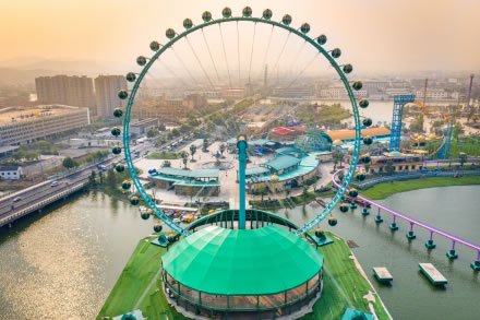 建設總高度達88米,掛有42個太空艙。從遠處看像是五彩繽紛的巨大風車在緩緩轉動,又似一顆顆晶瑩的珍珠鑲嵌于大轉盤之上。