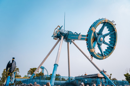 魔環(huán)飛車,可別小看這高度54米,軌道僅長150米、心型造型的魔環(huán)飛車,站臺出發(fā)后,緊接著的是50米的豎直快速提升,在跨度近40米的高架懸空橋梁軌道上連續(xù)360度回轉后,以接近89km/h的速度直沖地面,緊急制動后再來一次回旋俯沖,最后經過幾次刺激的“蕩秋千”后,緩慢倒退駛入站臺,這時,你的心跳才逐漸平復。