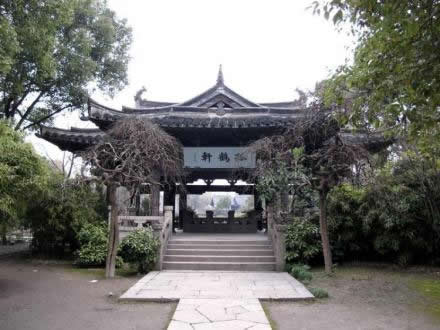 孤鶴軒位于沈園中部,是新辟建園林部分的景觀中心。北臨大荷花池宋池,與東北邊濱水小榭逼遙相對(duì),西邊緊靠六朝井,南邊是遺物壁和明池。軒為單檐歇山頂兩面帶廊的敞廳,平面為倒“凸”字形,寬而臨水。構(gòu)架為仿宋式木構(gòu),下為青石欄板圍起的挑空平臺(tái),造型秀麗曲雅。孤鶴軒亦稱“孤鶴哀鳴”處,是陸放翁的自喻。偉大愛國詩人陸游因南宋朝廷昏庸,壯志難以實(shí)現(xiàn),發(fā)出孤鶴的哀鳴,以孤鶴自喻,隱喻詩人在人生中痛失伴侶,事業(yè)上報(bào)國無門、愛民有罪、屢遭貶職的坎坷一生。亭內(nèi)有“亭池”遺址,1985年考古發(fā)掘時(shí)在此發(fā)現(xiàn)唐亭閣和明代的假山、魚池遺址。“孤鶴軒”匾額分為內(nèi)外兩塊,內(nèi)匾額由著名書畫家、文物鑒定家謝稚柳題寫,亭外由大康敬書。
