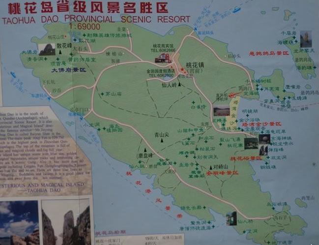 桃花島,擁有舟山群島第一高峰——安期峰;舟山第一深港——桃花港;東南沿海第一大石——大佛巖;是中國三大水仙名品之一的普陀水仙和浙江名茶普陀佛茶的主產(chǎn)地,又是浙江沿海林木品種最多的島嶼,有著“海島植物園”的美稱。其豐富的自然景觀、人文景觀和神話傳說有機(jī)融合,形成了六大景區(qū),即:桃花峪景區(qū)、塔灣金沙景區(qū)、安期峰景區(qū)、大佛巖景區(qū)、懸鵓鴣島景區(qū)和桃花港景帶,組合成武俠、佛教、道教文化三條旅游專線。擁有金沙日出、金龍吐珠、安期云霧、高山聞鐘、百家朝圣、山石桃花、奇洞探幽、桃港雄姿、礫灘涌潮、林帶煙樹、龍?zhí)逗熤、大佛夕?2大景觀和大佛巖、彈指峰、東海神珠、清音洞、白雀寺、仙人橋、含羞觀音、龍牙擎天、定海古城、安期煉丹洞等30余處主要景點(diǎn)。