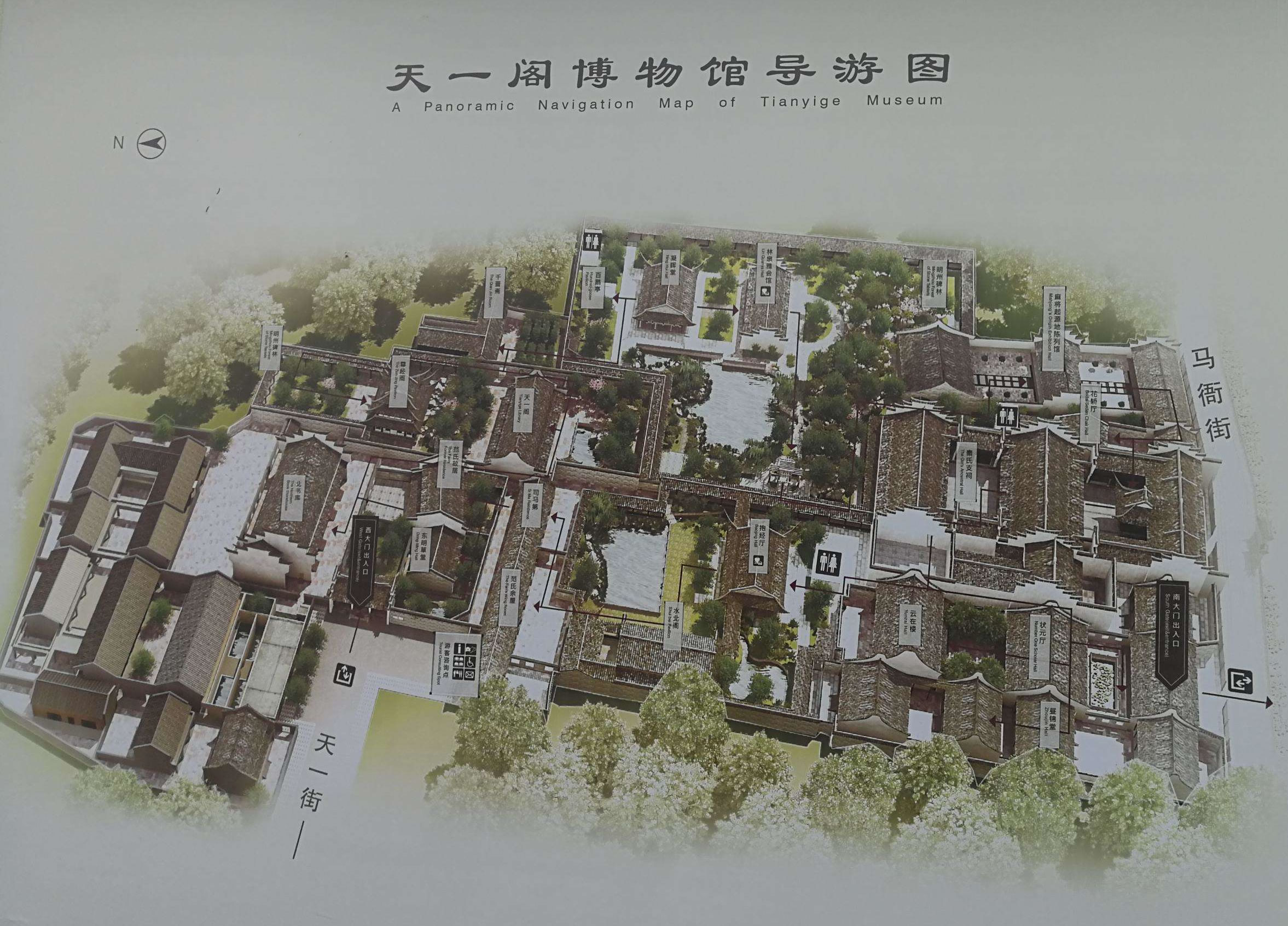 天一閣前為“天一池”通月湖,四周疊砌假山、修亭建橋、種花植草,建筑園林。園林以“福、祿、壽”作總體造型,用山石堆成“九獅一象”等景點。藏書樓西側生活區(qū)與藏書樓利用防火墻隔開,并使兩者的門錯開。藏書樓周邊擁有大量的安全出口。