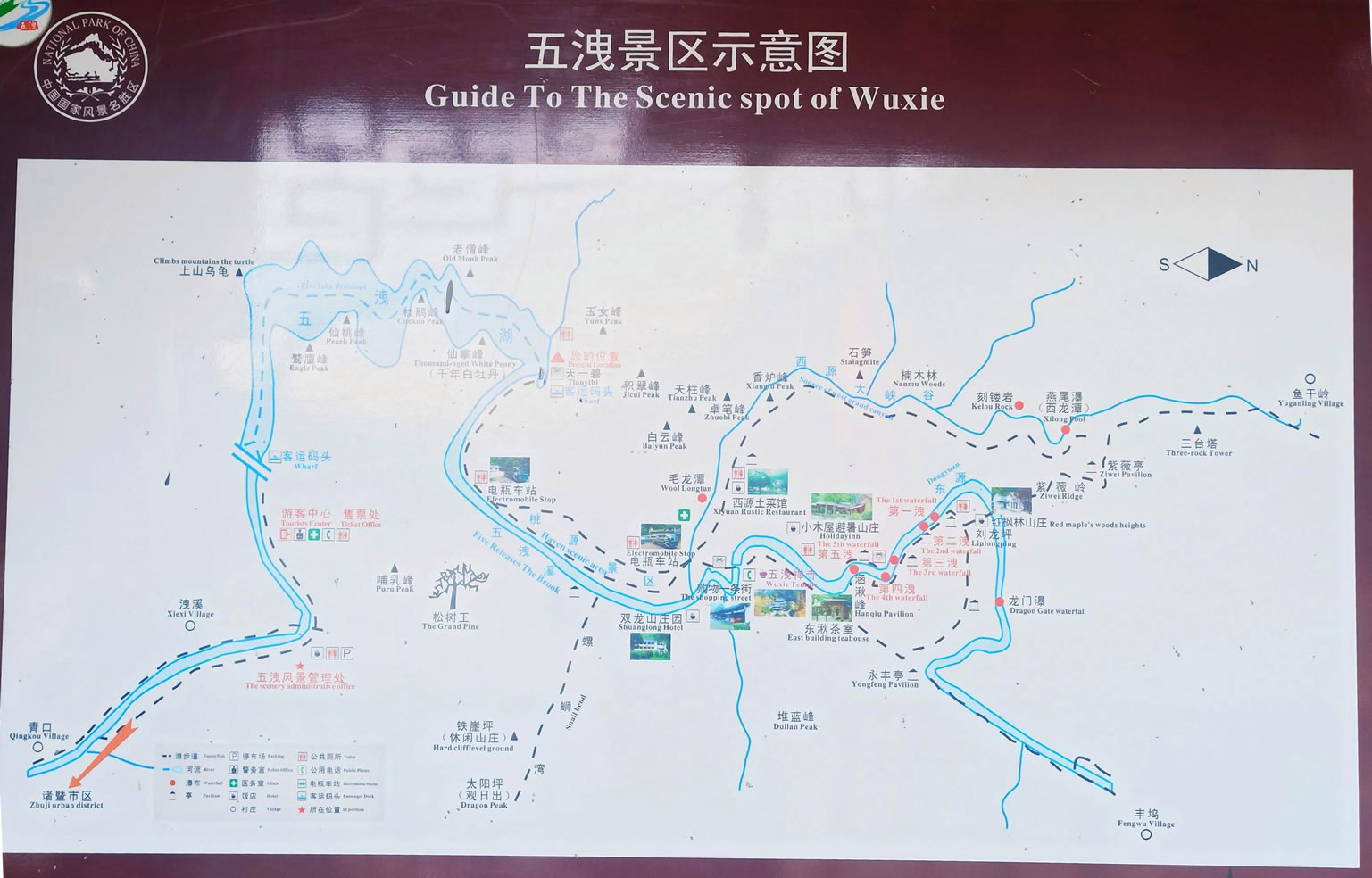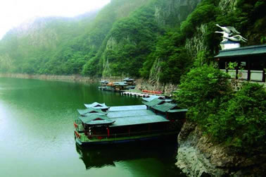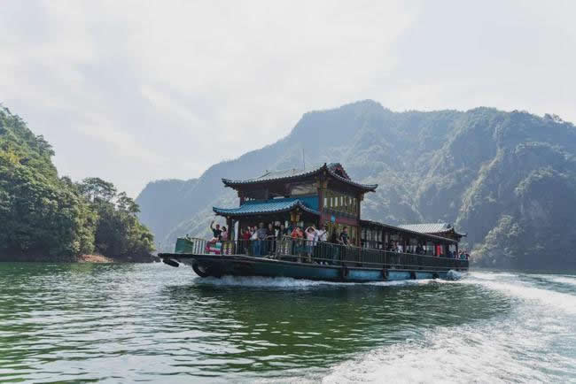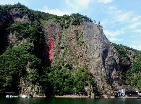 由紫藤長(zhǎng)廊拾階登上壩頂,眼前展現(xiàn)的是一湖靜水,綠水蕩漾,深不可測(cè)。 水面上疾駛的游船,不時(shí)激起層層漣漪,把兩岸的元寶峰,鷲鷹峰,仙桃峰、杜鵑峰、老僧峰、仙掌峰等山峰的倒影彎折。 泛舟湖上,水鳥在水面低飛,狹長(zhǎng)的湖面見不到盡頭,大有“青山綠水景無盡”之感,又有“一折青山一扇屏,一彎綠水一古琴”的詩(shī)意。沿湖兩邊,蔥蘢俊秀,美不勝收。春天萬(wàn)木崢嶸,紅杜鵑從綠樹叢中透出;夏天滿山蔥郁,濃蔭蔽日;一到秋冬季節(jié),蒼黃的銀杏葉和紅艷的楓葉,點(diǎn)綴在一片蕭瑟之中。
