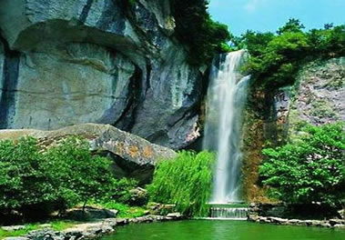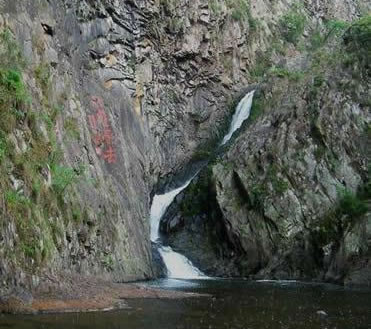 雙龍出海第二洩:二洩緊接一洩,落差為7.1米。瀑布下落時(shí),被一塊兀石分成兩半,分流如珠簾飄動(dòng),開朗而又深沉,又如雙龍出游不知天高地厚,古人有詩(shī)贊其曰:兩龍爭(zhēng)壑不知應(yīng),一石橫空不渡人。
