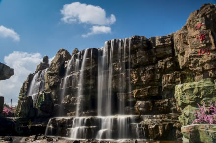 水簾洞水流湍急,寬60米,比著名的黃果樹瀑布還要寬30多米。這里的山巖是從真實的石頭上翻制下來,用玻璃鋼鑄片組裝,周圍的植物都是高仿真植物,包括棕櫚在內(nèi)的十多種品種。