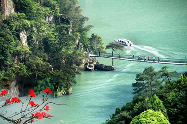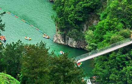 過龍?zhí),潭水平和,為峽谷漂流的登筏之處;懸空橋由鋼索懸架而成,長近70米,高逾40米,上橋行走,凌空晃蕩,不少游客會為之發(fā)怵心顫,給人以無窮刺激,有人稱之為“勇敢者橋”。五星橋頭設有山貨市場,可供應大峽谷內(nèi)的各種特產(chǎn)。